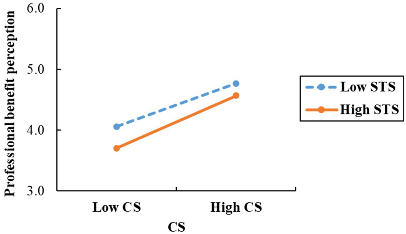 Nevertheless, the occupational implications of empathic engagement are multifaceted. While sustained experiences of CS can enhance motivation to help, Stamm’s study (30) indicates a dual nature of empathic engagement among helpers. This engagement may either augment the perception of professional benefits via CS or incite STS due to excessive empathy. According to post-traumatic growth theory (31), the adverse effects of STS can potentially be mitigated or even transformed into opportunities for developing professional competence when helpers find meaning in their work. For nursing interns, encountering STS in clinical practice is unavoidable; however, the direction of its moderating effect—whether positive or negative—requires empirical investigation. The threshold effects and transformative mechanisms of such empathic engagement represent a crucial theoretical point for understanding the pathways through which a professional sense of benefit is formed.