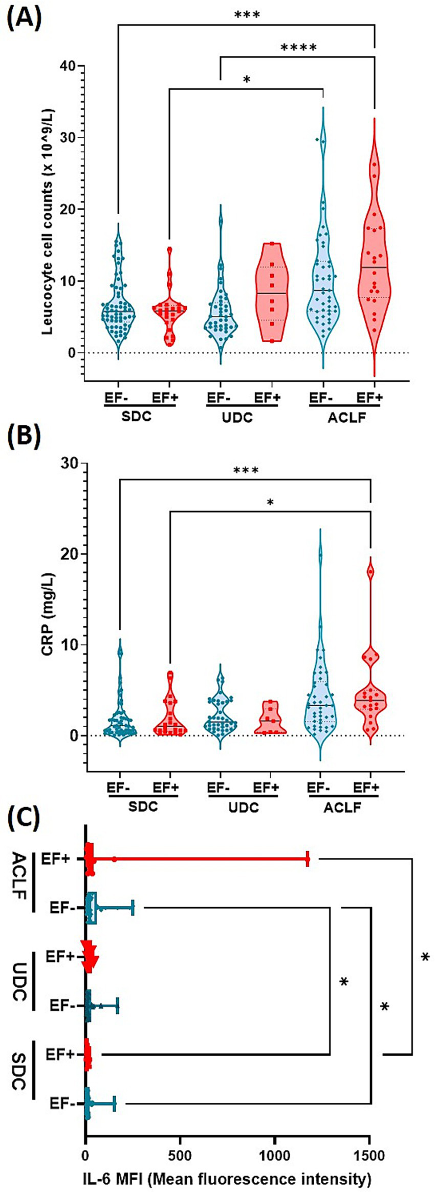E. faecium DNA positivity is associated with elevated leukocyte count, CRP, and IL-6, indicating intensified inflammation in advanced cirrhosis stages. Plasma levels of Leucocyte count (A), CRP (B) and IL-6 (C). Significant differences were observed between patients who were E. faecium (EF) DNA negative (EF-) and those who were EF DNA positive (EF+), across the following patient groups: stable decompensated cirrhosis (SDC), unstable decompensated cirrhosis (UDC) and acute-on-chronic liver failure (ACLF), indicated by asterisk (*p< 0.05, ***p< 0.005, ****p< 0.0001). p-values were determined using one-way ANOVA with Kruskal-Wallis test or with FDR and Benjamin Hochberg correction (Figure 2c). Color codes: turquoise = EF-; red = EF+.
