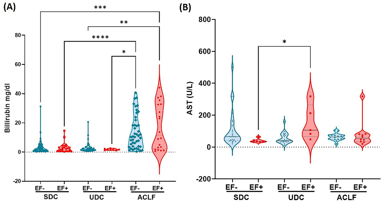 Our analysis of liver inflammation markers revealed significant variations in plasma bilirubin and AST levels across disease phenotypes and EF DNA status (Figure 3). Plasma bilirubin levels (Figure 3A) were markedly elevated in ACLF EF+ patients, who showed the highest concentrations across all groups. Statistically significant differences were observed between ACLF EF+ and other subgroups, including SDC EF+, SDC EF-, UDC EF+, and UDC EF- (p≤0.05 to p ≤ 0.005; Figure 3A). These findings suggest that bilirubin elevation is primarily driven by disease severity rather than EF DNA status. Serum AST levels (Figure 3B) were less different between the groups with UDC EF+ patients showing the highest levels which were significantly elevated compared to SDC EF+ patients (p≤ 0.05; Figure 3B). However, no significant differences were detected between EF+ and EF- patients within the same phenotype. The findings related to liver function emphasize the link between liver dysfunction markers and disease severity, particularly in ACLF patients. While EF DNA presence does not independently alter bilirubin or AST levels within each disease stage, it may contribute to worsening liver function in more advanced phenotypes such as UDC and ACLF.