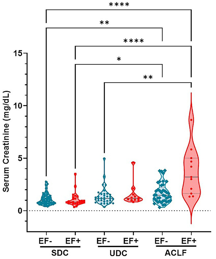 Analysis of plasma creatinine levels revealed a correlation EF DNA detection in patient sera and kidney function (Figure 4). Creatinine concentrations were the highest in ACLF EF+ patients compared to most other subgroups including SDC EF-, SDC EF+ and UDC EF- groups, indicating more severe kidney dysfunction in this group (p≤ 0.0001 to p ≤ 0.005). Additionally, creatinine levels in ACLF EF- patients were significantly higher than those in SDC EF+ and SDC EF- groups (p≤ 0.005), further underscoring the impact of disease severity on renal function (Figure 4). Among the SDC and UDC groups, creatinine levels were relatively lower and showed no statistically significant differences between EF+ and EF- patients. These findings indicate that the presence of EF DNA is associated with worsened kidney function in patients with ACLF, while its impact is less evident in earlier stages of liver disease. Despite marked differences in creatinine levels, sodium and potassium concentrations remained consistent across all patient groups (data not shown). These results indicate that the presence of EF DNA is associated with more severe kidney dysfunction, particularly in ACLF patients, where SI and renal impairment are most pronounced.
