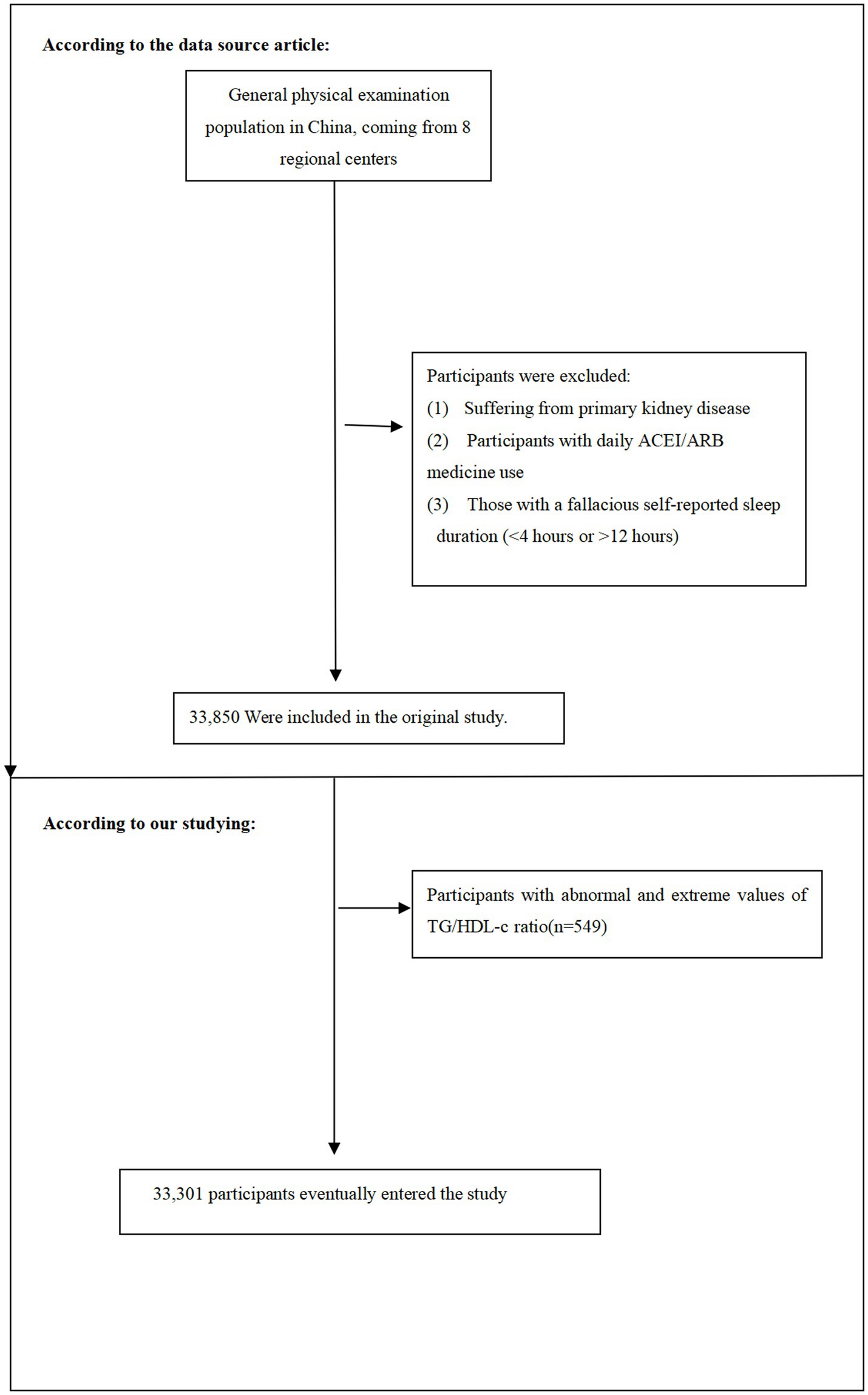 The initial study (25) employed the following criteria for exclusion:(1) Individuals with primary kidney disease; (2) Participants on daily ACEI or ARB medications; (3) Those with a fallacious self-reported sleep duration (<4 h or >12 h). Ultimately, the initial research involved 33,850 individuals in the analysis.