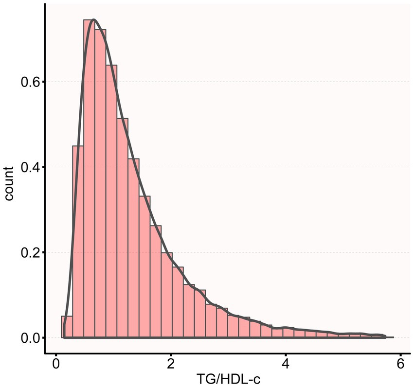 The histogram shows the distribution of TG/HDL-c values among all participants. TG/HDL-c ratio exhibited a Right-skewed distribution with values ranging from 0.143 to 5.730, with a mean value of 1.314.