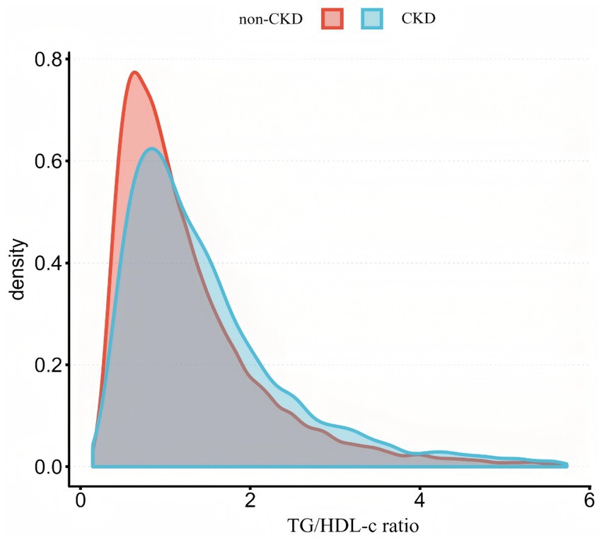 Figure 3 illustrates the comparison of the distribution of TG/HDL-c ratio between participants with and without CKD. The results indicated that the CKD group demonstrated higher TG/HDL-c ratio levels compared to the non-CKD group.
