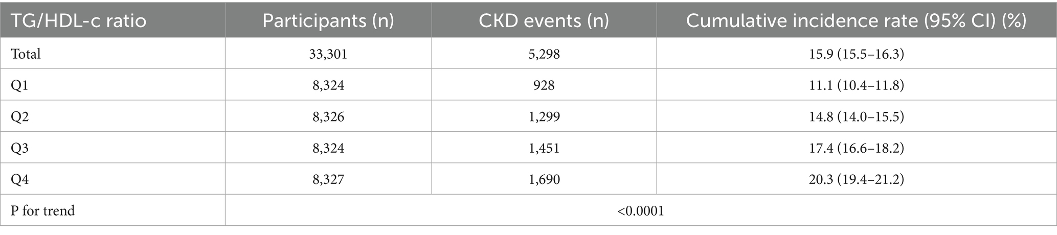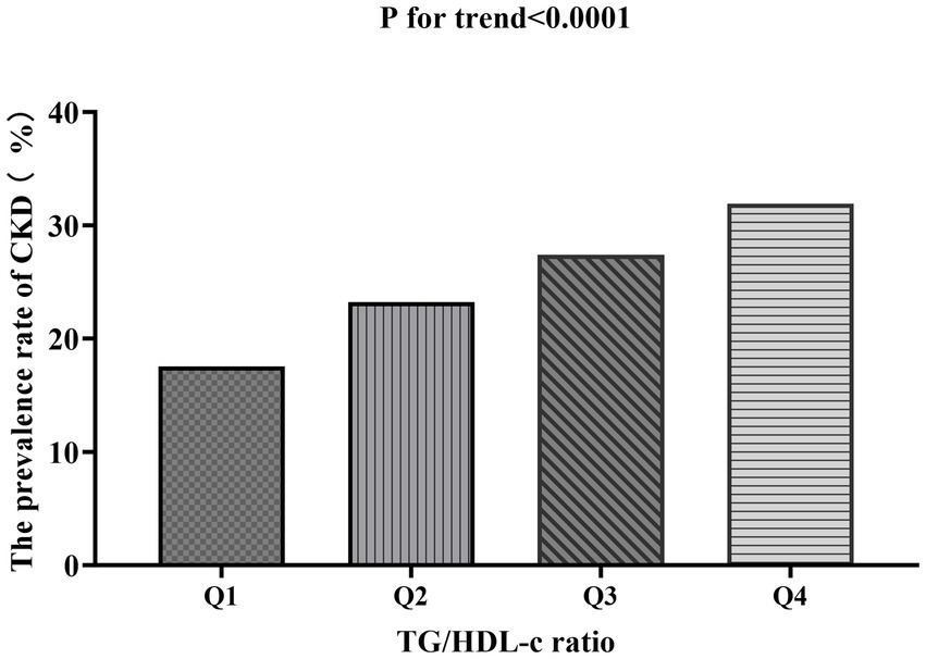 Table 2 shows that among all participants, a total of 5,298 individuals had chronic kidney disease (CKD). The overall prevalence rate was 15.9% (15.5–16.3%). The prevalence of CKD varied across the four groups based on the TG/HDL-c ratio, with a significant increase in incidence compared to the Q1 (<0.69) group. Specifically, the prevalence rates for each TG/HDL-c ratio group were as follows: 15.9% (15.5–16.3%), 11.1% (10.4–11.8%), 14.8% (14.0–15.5%), 17.4% (16.6–18.2%), and 20.3% (19.4–21.2%). Notably, participants in the high TG/HDL-c ratio group had a higher prevalence of CKD compared to those in the lowest TG/HDL-c ratio group (p < 0.0001 for trend; Figure 4).