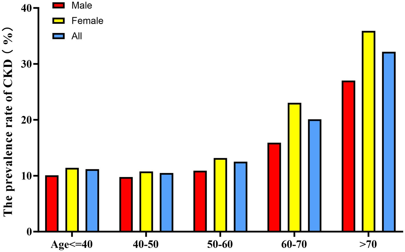 When stratified by 10-year age intervals, the prevalence of CKD was consistently higher in the female population compared to their male counterparts across all age groups (Figure 5). Furthermore, a significant age-associated increase in CKD risk was observed in both male and female participants.