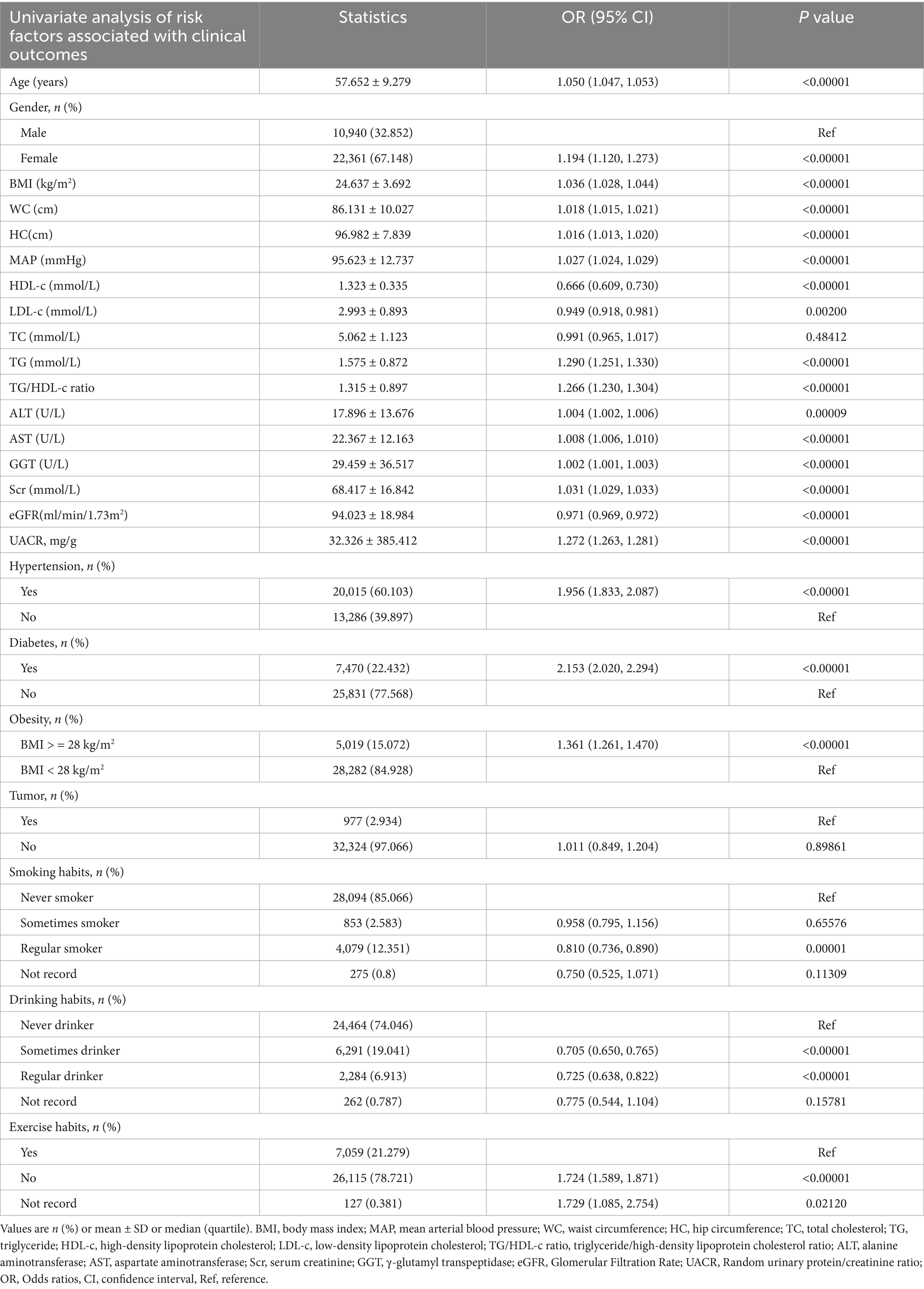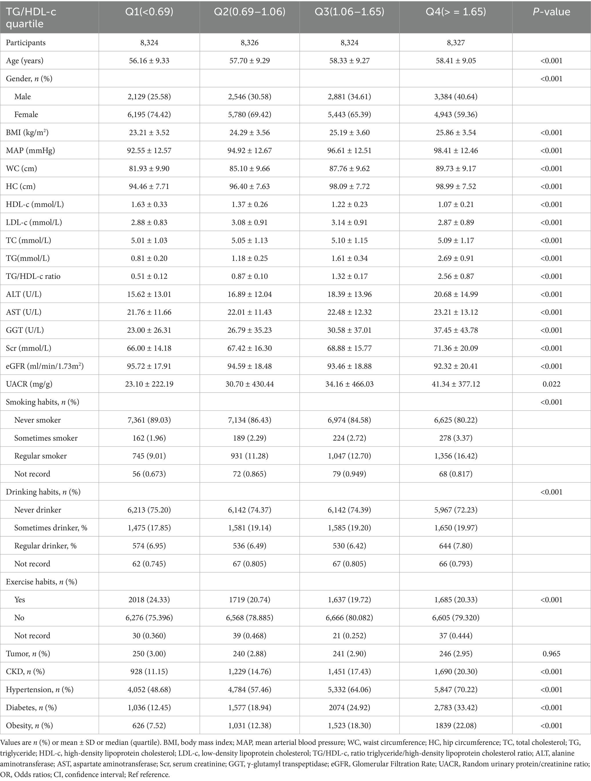Table 1 provided the demographic and clinical characteristics of participants included in the study. A total of 33,301 research subjects were included in the final analysis, of which females accounted for 67.15%, with an average age of 57.65 ± 9.28 years. The median TG/HDL-C ratio was 1.06 (0.69–1.65), the average BMI was 24.64 ± 3.69 kg/m2. The prevalence of CKD was 15.91% (5,298/33,301). Participants were categorized into subgroups based on the quartiles of the TG/HDL-c ratio (<0.69, 0.69 to 1.06, 1.06 to 1.65, ≥1.65). There were no significant differences in tumor history among the different quartiles of the TG/HDL-c ratio (p value > 0.05). Compared with Q1, participants in Q4 demonstrated significantly higher levels of age, BMI, WC, HC, MAP, TC, TG, ALT, AST, GGT, UACR, and TG/HDL-c ratio, with greater proportions of males, hypertension, diabetes and tobacco/alcohol users (Table 1).