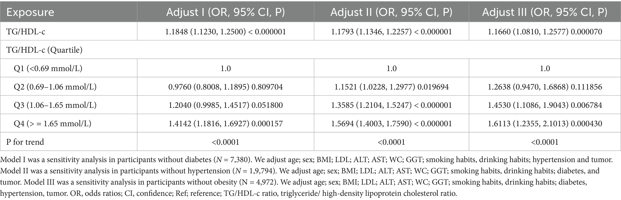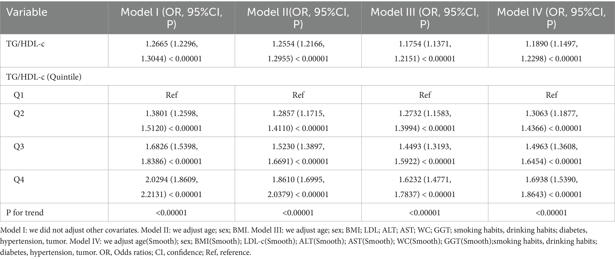 To confirm the robustness of our findings, we conducted a series of sensitivity analyses by transforming TG/HDL-c ratio into a categorical variable based on quartiles and incorporating it into the model. In these analyses, we examined CKD risk across TG/HDL-c ratio quartiles (Table 4). In the unadjusted model (Model I), compared with the lowest quartile, the ORs for CKD were 1.3801 (95% CI, 1.2598–1.5120), 1.6826 (95% CI, 1.5398–1.8368), and 2.0294 (95% CI, 1.8609–2.2131) for the second, third, and fourth quartiles, respectively. These associations persisted after adjusting for age, sex, BMI, LDL-c, ALT, AST, WC, GGT, smoking, drinking, diabetes, hypertension, and tumor history (Model II). In the fully adjusted model (Model III), the ORs were 1.2732 (95% CI, 1.1583–1.3994), 1.4493 (95% CI, 1.3193–1.5922), and 1.6232 (95% CI, 1.4771–1.7837) for the second, third, and fourth quartiles, respectively (P for trend <0.00001). The non-uniform effect size trends across quartiles suggested a potential non-linear relationship between TG/HDL-c ratio and CKD risk.