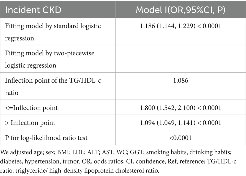 Generalized additive model and smooth curve fitting revealed a non-linear association between TG/HDL-c ratio and CKD risk (Figure 6). Based on sensitivity analyses using a standard binary logistic regression model, we selected the optimal fit through log-likelihood ratio testing (p < 0.05; Table 6). Subsequently, a two-piecewise binary logistic regression model was implemented, with a recursive algorithm identifying an inflection point at 1.086. Analysis revealed distinct associations on either side of this inflection point: below the threshold, the odds ratio was 1.800 (95% CI 1.542 to 2.100), while above it, the association strengthened to 1.094 (95% CI 1.049 to 1.411).