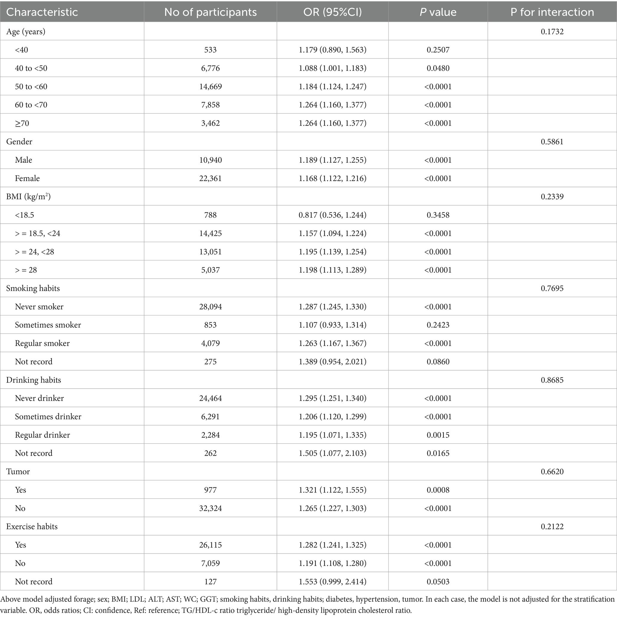 We conducted stratified logistic regression analyses to investigate potential effect modifications by gender, age, BMI, smoking status, drinking status, exercise habits, and cancer history. Prior to analysis, continuous variables were transformed into categorical variables using established clinical thresholds. Age was categorized into five groups (<40, 40–50, 50–60, 60–70, ≥70 years), and BMI was classified into four categories (< 18.5, ≥ 18.5 to < 24, ≥ 24 to < 28, ≥ 28 kg/m2). Additional categorical variables included smoking status (Regular smoker, Sometimes smoker, Never smoker), drinking status (Regular drinker, Sometimes drinker, Never drinker), exercise habits (Yes, No), and tumor history (Yes, No). Each stratified analysis incorporated adjustments for all covariates except the stratification variable itself, including gender, age, BMI, LDL-c, ALT, AST, GGT, smoking and drinking status, hypertension, and cancer history. Interaction effects were assessed through likelihood ratio tests comparing models with and without interaction terms (37, 38).