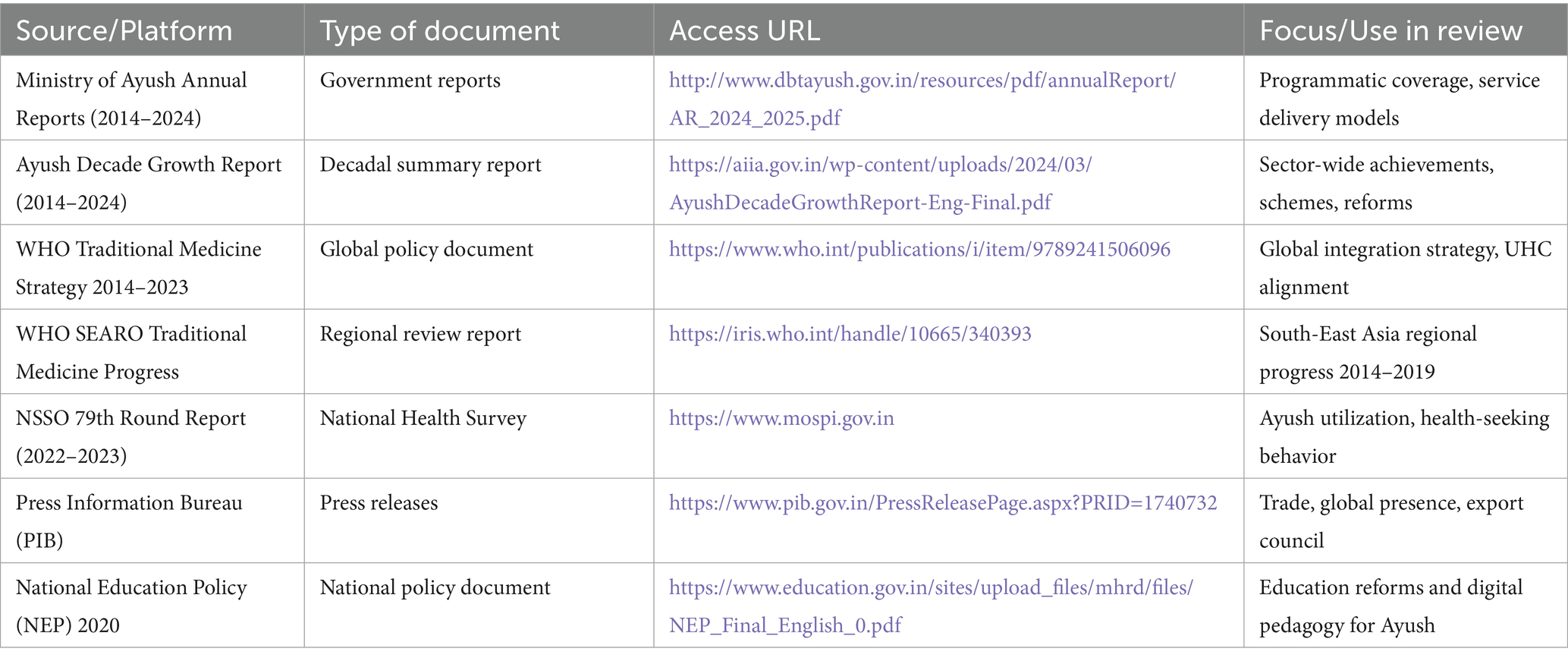 • Type of Sources: Peer-reviewed publications, national and international policy documents, official Ayush statistics, and validated institutional reports