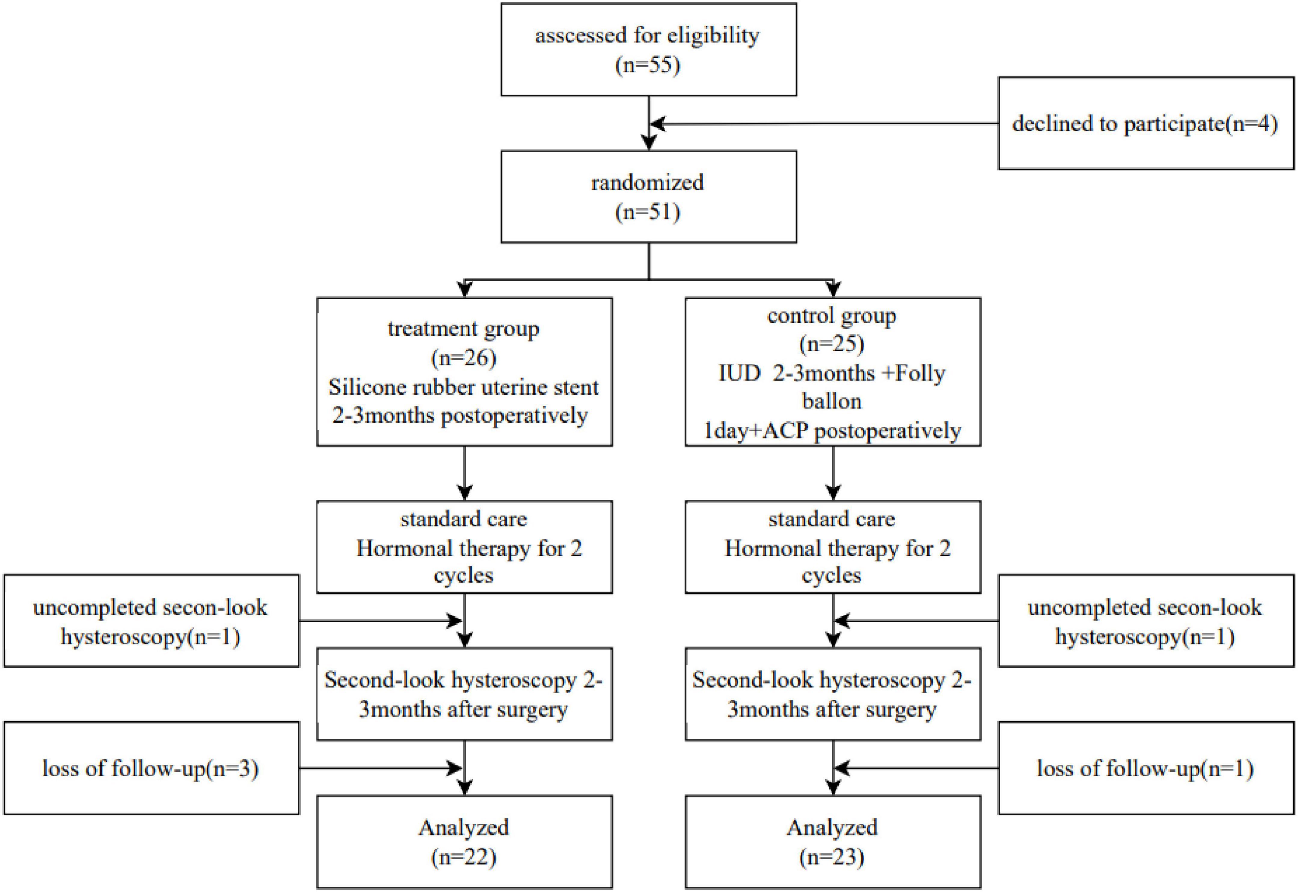 This clinical trial was registered on Chinese Clinical Trials Registry (URL: ClinicalTrials.gov) on 30 June 2021 (No: NCT05474756). In this prospective randomized controlled trial, participants were recruited between April 2019 and January 2021 from the Department of Gynecology of Tiantan Hospital, Beijing. The inclusion criteria were women aged 20–40 years with moderate to severe IUA [American Fertility Society (AFS) score ≥ 5], patients with a desire for future fertility and IUA as the only infertility factor. Patients were excluded if they had received estrogen therapy within 30 days before the procedure or had severe systemic disease or any contraindications to TCRA surgery.