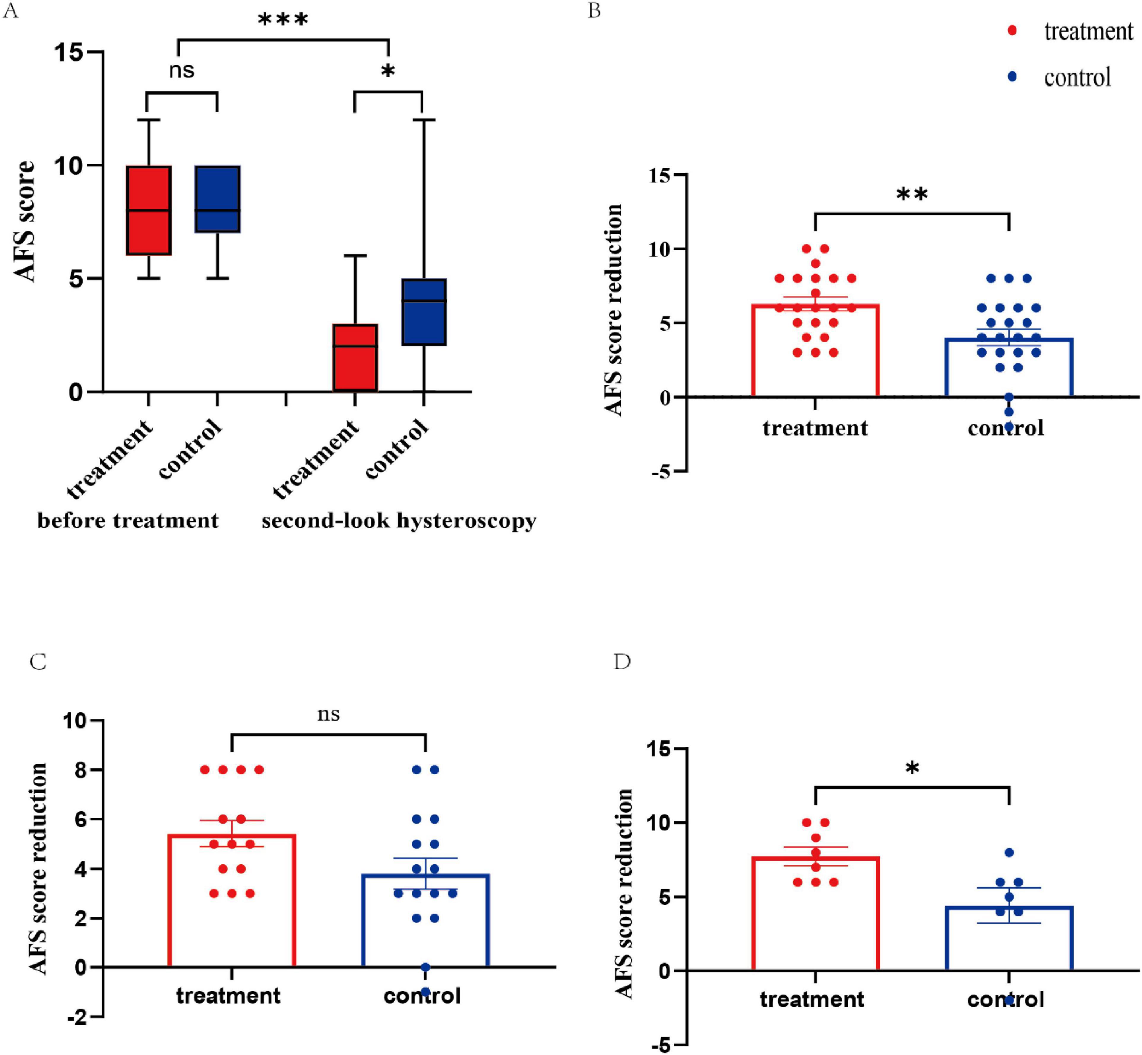 Figure 3. AFS score and the reduction in the scores before treatment and second-look AFS score. (A) Comparison of pre- and postoperative adhesion scores. (B) Reduction in the AFS score of the treatment group and control group. (C) Reduction in the AFS score of patients with moderate adhesion. (D) Reduction in the AFS score of patients with severe adhesion. AFS, American Fertility Society; NS, not significant. *P < 0.05, **P < 0.01, ***P < 0.001.