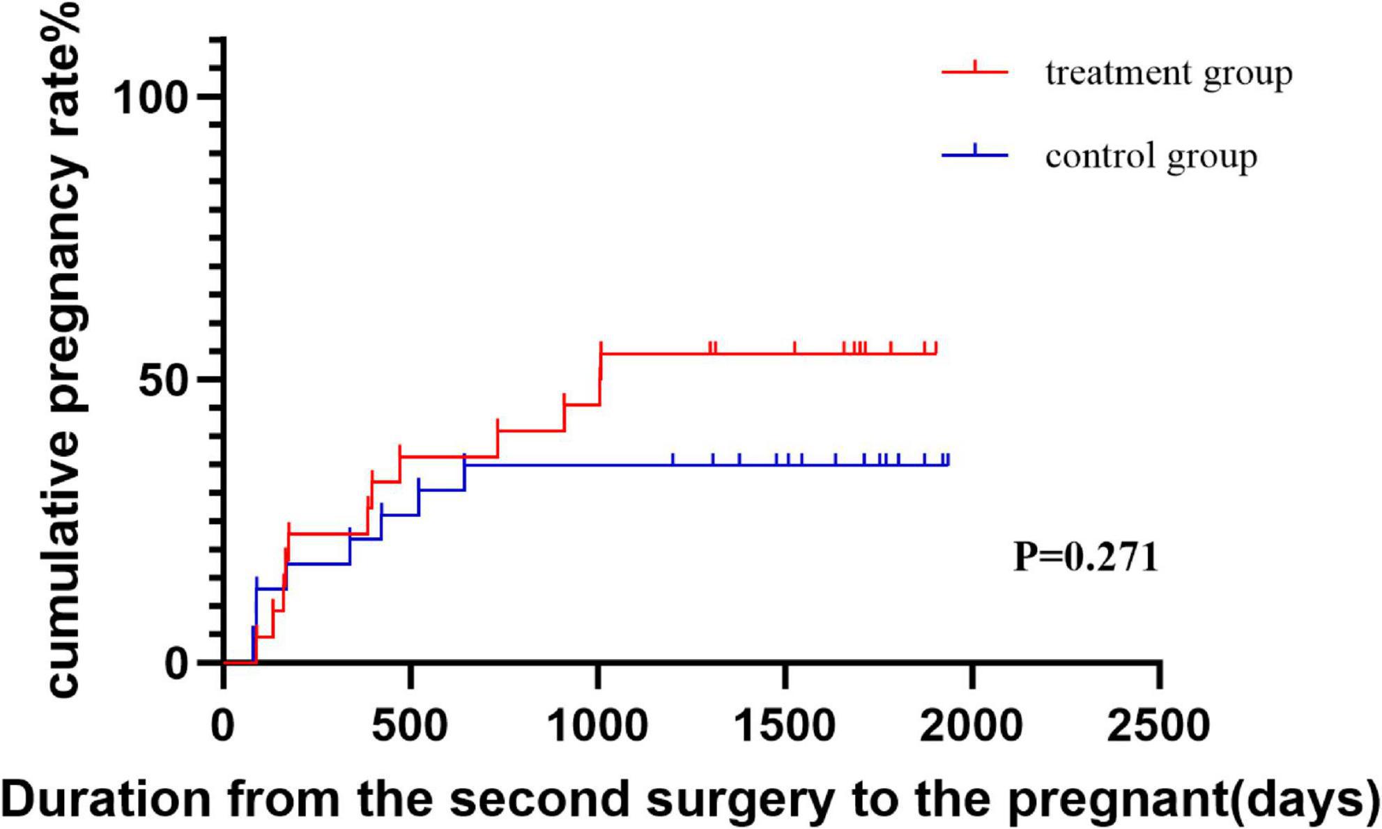 The pregnancy rate in the treatment group was not significantly different from that in the control group (P = 0.182, Table 3). Cumulative pregnancy rates over the follow-up period were illustrated using Kaplan–Meier curves (Figure 4). The log-rank test showed a trend toward higher cumulative pregnancy probability in the treatment group compared with controls (P = 0.27). Cox regression analysis yielded an HR of 1.62 (95% CI: 0.71–3.72), suggesting a non-significant trend of increased likelihood of conception in the treatment group. These results indicate that the observed differences in pregnancy outcomes should be interpreted cautiously. Furthermore, the median gestation time from second surgery to conception was 33 months in the treatment group, and the control group was not followed up. According to the Kolmogorov–Smirnov curve, PR was greater in the treatment group than in the control group at any point after 6 months.