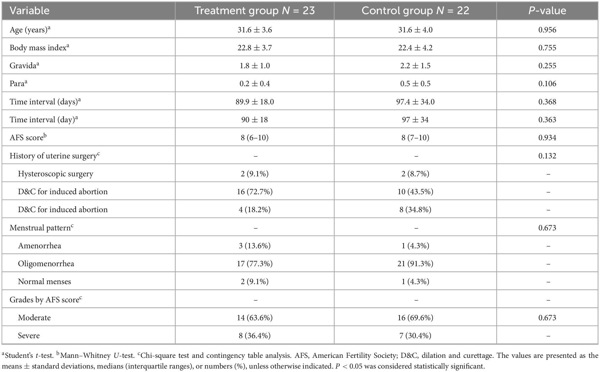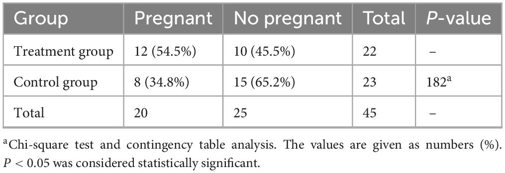 Among the 55 eligible patients, Figure 2 shows the flow chart of the study with annotated exclusions. Four declined participation before randomization, two withdrew during the study, and four were lost to follow-up, resulting in 45 patients who completed the study (22 in the treatment group and 23 in the control group) (Figure 2). The baseline characteristics of the patients who completed the study were similar across groups, and the characteristics of those who declined, withdrew, or were lost to follow-up were comparable to the analyzed population, suggesting that these losses are unlikely to have biased the primary or secondary outcomes, including pregnancy rates (Table 1).
