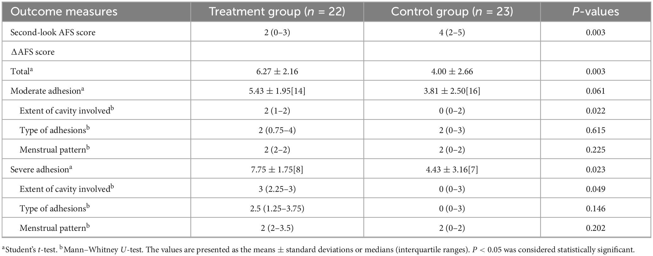 Compared with the AFS score before treatment, the second-look AFS score was significantly lower in both the treatment and control groups (Figure 3A). The AFS score at the second-look hysteroscopy in the treatment group was significantly lower than that in the control group (P = 0.003, Table 2). Furthermore, patients in the treatment group had greater AFS score reductions than did those in the control group (6.27 ± 2.16 vs. 4.00 ± 2.66, p = 0.003; Figure 3B). In patients with moderate adhesions, the AFS score was not significantly different between the two groups (5.43 ± 1.95 vs. 3.81 ± 2.50, P = 0.061; Figure 3C). However, in patients with severe adhesions, the reduction in AFS score was more significant in the treatment group than in the control group (7.75 ± 1.75 vs. 4.43 ± 3.16, P = 0.230; Figure 3D). According to the subgroup analysis of AFS scores, patients in the treatment group had greater extents of cavity involvement scores than did those in the control group in both the moderate and severe adhesion groups did (P < 0.05), whereas the types of adhesion scores and menstrual pattern scores were not significantly different (P > 0.05). A post hoc power analysis based on the AFS score reduction demonstrated adequate statistical power for the primary endpoint (power = 0.83 at α = 0.05), supporting the robustness of the main finding.
