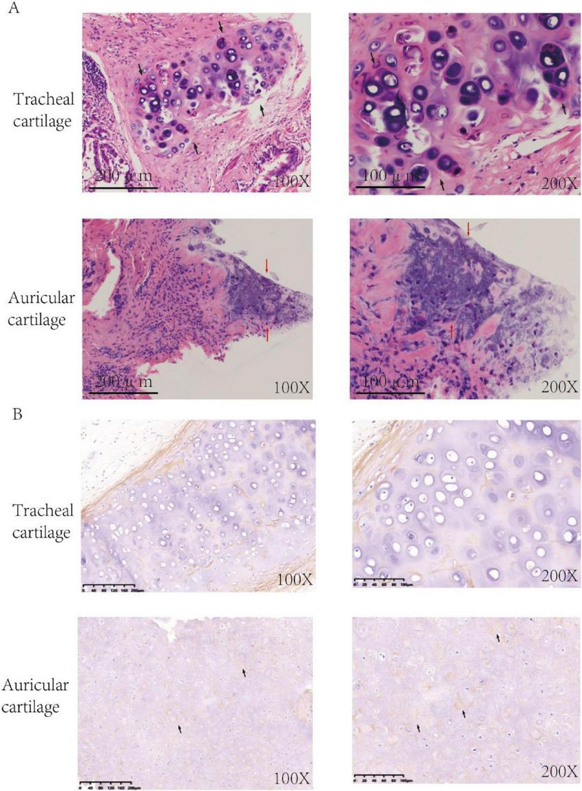 (A) HE-stained sections of cartilage tissue. HE staining of tracheal cartilage prior to surgery is depicted in panels, and HE staining of auricular cartilage tissue post-surgery is depicted (Black arrows: chondrocytes, Red arrows: lymphocyte infiltration). (B) Immunohistochemistry of cartilage tissue. Immunohistochemical analysis using Anti-Col II antibody demonstrated significantly elevated expression of the Anti-Col II (black arrows) in postoperative auricular cartilage in comparison to preoperative tracheal cartilage.