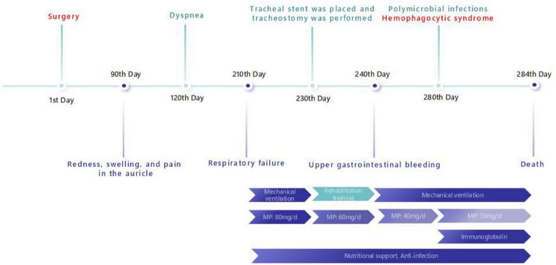After being diagnosed with RP, the patient was treated with methylprednisolone 80 mg/day for 20 days. Following treatment, the ventilator support parameters decreased to a level suitable for weaning. However, because of extensive stenosis of the trachea and bilateral main bronchi, the patient had a high risk of recurrent dyspnea upon ventilator withdrawal. Therefore, tracheostomy was performed, and a tracheal stent was placed to provide structural support. Subsequently, the patient was successfully weaned from mechanical ventilation, meanwhile, the methylprednisolone dosage was adjusted to 60 mg/day, and he began rehabilitation training, including whole-body muscle strength training, massage therapy, transfer movement training, and stationary bicycle rehabilitation. Unfortunately, 10 days later, he patient subsequently developed upper gastrointestinal bleeding, upon which we reduced the methylprednisolone dosage to 40 mg/day and managed the bleeding actively. Over the next 40 days, the patient developed multiple infections (bacterial, viral, and fungal), leading us to further taper the methylprednisolone dosage to 30 mg/day; nevertheless, the patient ultimately progressed to hemophagocytic syndrome. Despite aggressive interventions, including ventilator support, broad-spectrum antimicrobial therapy, and intravenous immunoglobulin, the patient’s condition deteriorated, leading to a fatal outcome (Figure 3).
