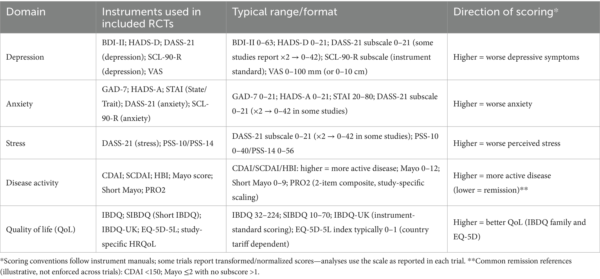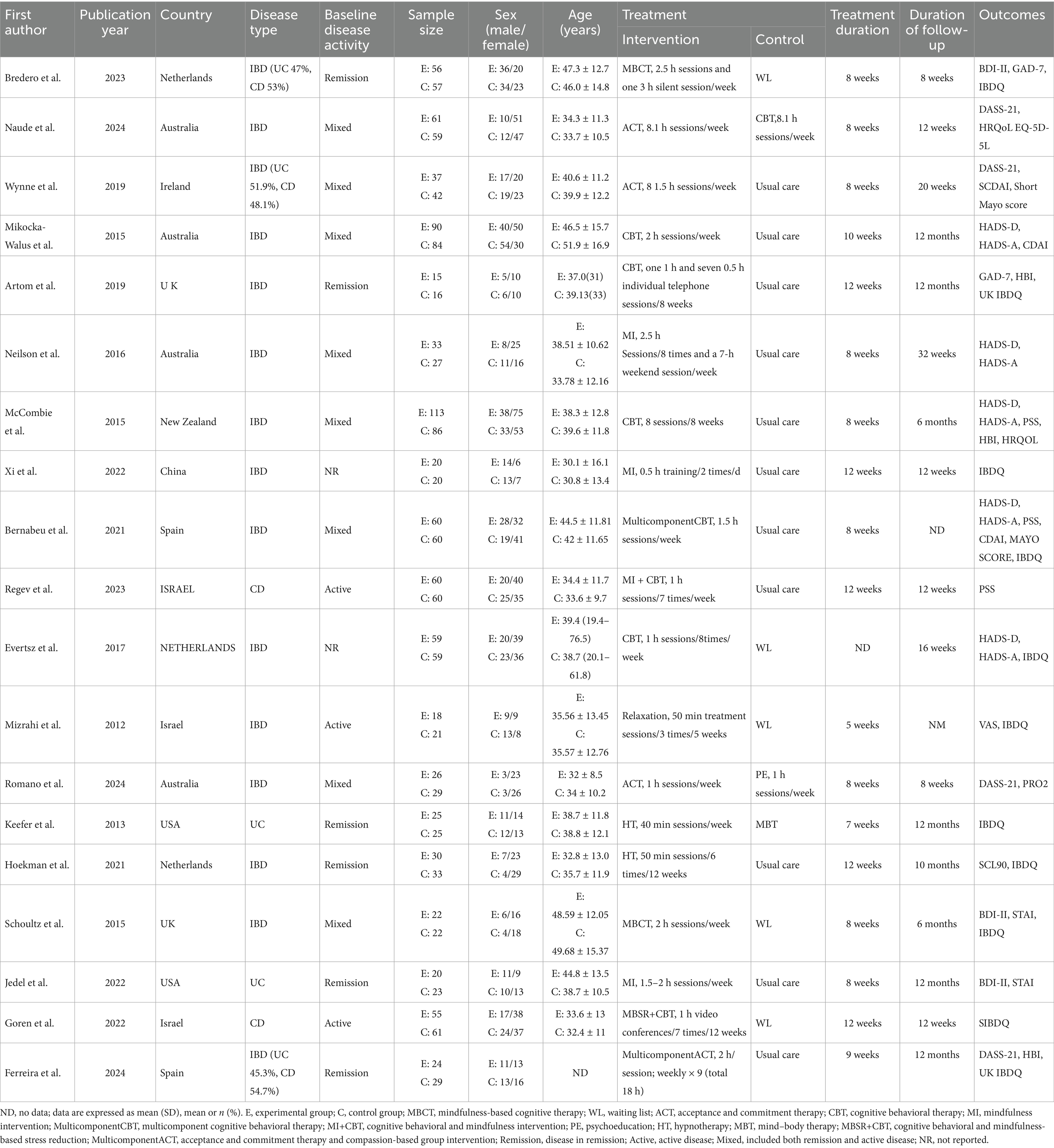 Literature that met the following criteria was included in this study: (1) Study population: patients (≥18 years old) who had a diagnosis of IBD, confirmed by endoscopy, histological examination, and the third edition of the European guidelines for the diagnosis and treatment of UC and CD (35); (2) Interventions (each group using one of the psychological interventions mentioned below): Cognitive Behavioral Therapy (CBT), Acceptance and Commitment Therapy (ACT), Mindfulness Interventions (MI), Relaxation Training, Hypnotherapy (HT), and Mindfulness-Based Stress Reduction (MBSR); Control: Usual Care (including usual care, usual treatments, and unprofessional psychotherapies), Waiting List (WL, delayed access to the intervention while continuing UC); or intercomparisons between different psychological interventions; (3) Type of Study: randomized controlled trials; (4) Outcome indicators and diagnostic criteria: depression, anxiety, stress, disease activity, quality of life. The diagnosis of depression was based on the Beck Depression Inventory, Second Edition (BDI-II), Depression Anxiety Stress Scales-21 Items (DASS-21), Hospital Anxiety and Depression Scale-Depression Subscale (HADS-D), visual analog scale (VAS), and Symptom Checklist-90-Revised (SCL-90-R); and for the diagnosis of anxiety, refer to the Generalized Anxiety Disorder-7 (GAD-7), DASS-21, Hospital Anxiety and Depression Scale-Anxiety Subscale (HADS-A), SCL-90-R, State–Trait Anxiety Inventory (STAI); Diagnosis of stress was made with reference to scales such as DASS-21, Perceived Stress Scale (PSS); diagnosis of disease activity was made with reference to Crohn’s Disease Activity Index (CDAI), Short Crohn’s Disease Activity Index (SCDAI), Harvey-Bradshaw Index (HBI), Patient-Reported Outcome (PRO2), and Mayo Score; for the diagnosis of quality of life, refer to the Inflammatory Bowel Disease Questionnaire (IBDQ), Short Inflammatory Bowel Disease Questionnaire (IBDQ), Short Inflammatory Bowel Disease Questionnaire (SIBDQ), Health-Related Quality of Life (HRQOL), and EuroQol Five Dimensions Five-Level (EQ-5D-5L) scales (Table 1).