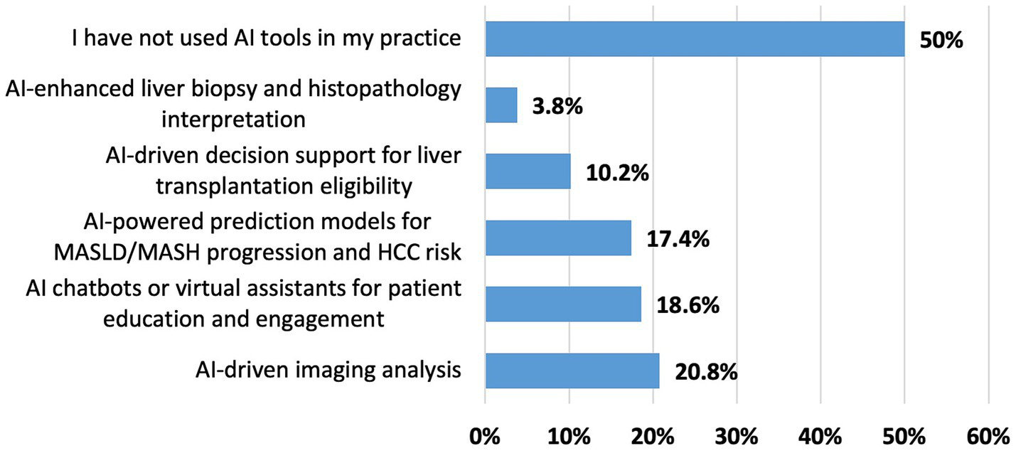 In the Middle East and North Africa (MENA) region, the adoption of AI in hepatology and gastroenterology has been relatively slow (9). This delay may be attributed to a lack of awareness, technical capacity, regulatory guidelines, and concerns regarding data privacy and clinical reliability. Understanding the perspectives of hepatologists on AI is crucial for addressing these challenges and effectively integrating AI-generated tools into clinical practice. Accordingly, we assessed hepatologists’ familiarity with AI, usage patterns, and concerns about its integration into practice to inform strategies for adoption across the MENA region. This work addresses a specific gap not covered by prior surveys in other regions and specialties (9–15): it is the first multinational assessment focused specifically on hepatologists from 17 MENA countries; it evaluates clinical and research use of AI alongside institutional readiness; and it integrates quantitative findings with a thematic synthesis of policy-level recommendations.