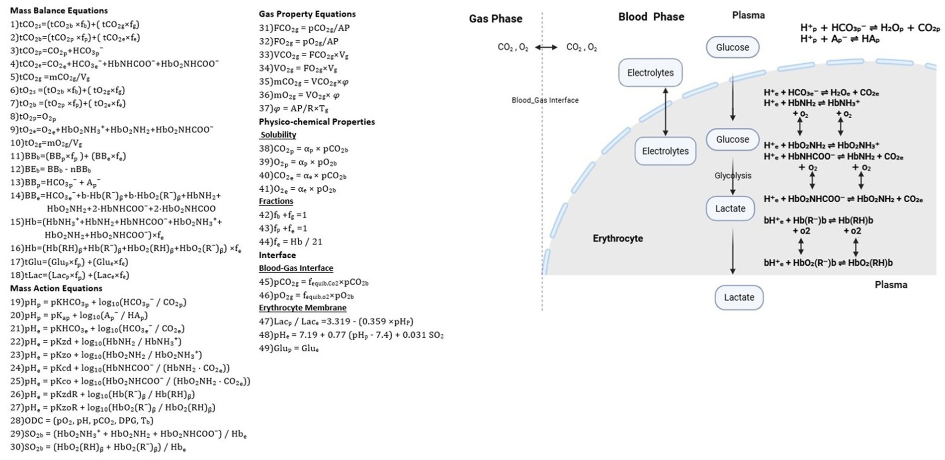 Chemical equilibrium equations for mass balance and gas properties are presented alongside a diagram illustrating gas exchange at the blood-gas interface. The diagram shows the interactions between gas phases (CO₂, O₂), blood phases (Electrolytes, Glucose, Lactate), and erythrocytes, highlighting processes like glycolysis and gas exchanges with reactions involving bicarbonate and hemoglobin.