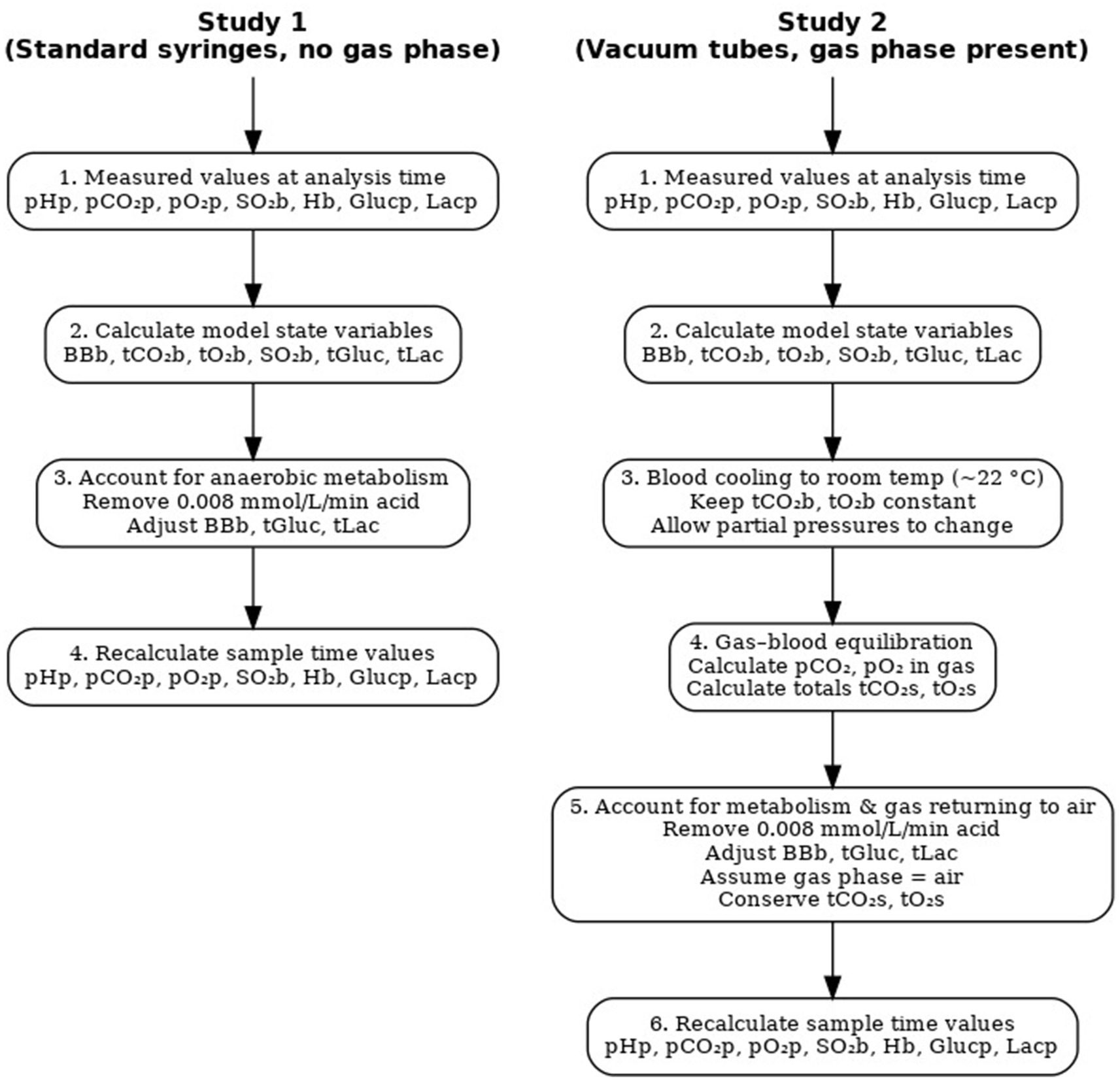 Flowchart comparing Study 1 (standard syringes, no gas phase) and Study 2 (vacuum tubes, gas phase present). Both studies start by measuring values. Study 1 adjusts for anaerobic metabolism and recalculates values, while Study 2 involves blood cooling, gas-blood equilibration, accounting for metabolism, and recalculating values. Steps include model state variable calculations and adjustments for different conditions, like temperature and metabolism.