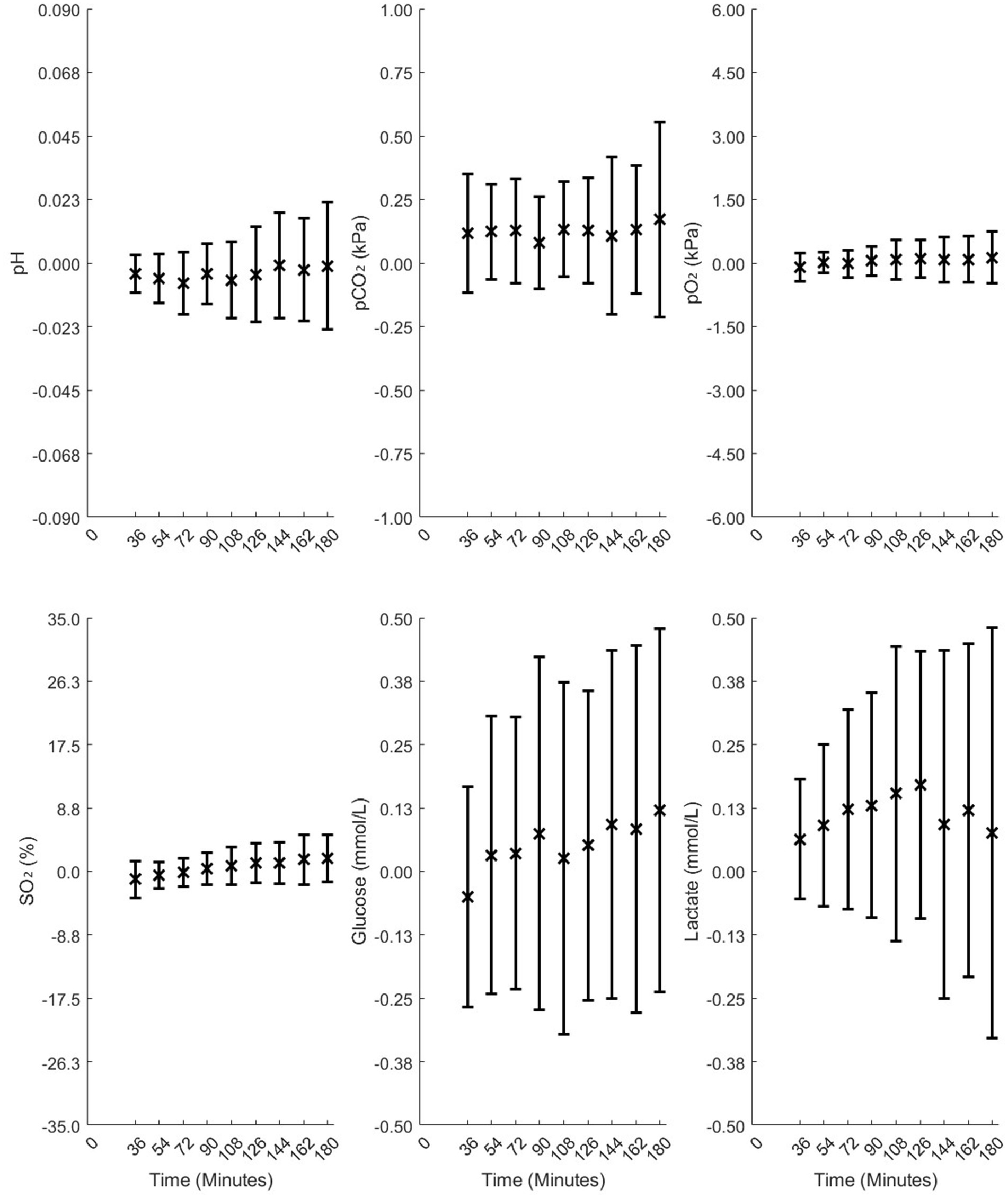 Figures 35 illustrate the mean differences (accuracy) and SD of the differences (precision) obtained by comparing measured and calculated values at the sample time from different analysis time points in Studies 1 and 2. Common to these figures are measurements taken 90 min after sampling, a duration that may be important in relation to blood sample transport to the laboratory. The mean and SD values at 90 min for Study 1 are as follows: pH = −0.004 ± 0.011, pCO₂ = 0.08 ± 0.18 kPa, pO₂ = 0.05 ± 0.34 kPa, SO₂ = 0.39 ± 2.21%, Glu = 0.07 ± 0.35 mmol/L, and Lac = 0.13 ± 0.22 mmol/L. For Study 2, the results at 90 min for 4-mL vacuum tubes are as follows: pH = 0.006 ± 0.007, pCO₂ = −0.07 ± 0.11 kPa, pO₂ = −0.37 ± 0.34 kPa, SO₂ = −7.79 ± 4.95%, Glu = 0.01 ± 0.11 mmol/L, and Lac = −0.00 ± 0.20 mmol/L. For 2-mL vacuum tubes, the results are as follows: pH = 0.021 ± 0.030, pCO₂ = −0.28 ± 0.52 kPa, pO₂ = −1.33 ± 3.96 kPa, SO₂ = −12.64 ± 18.27%, Glu = 0.00 ± 0.14 mmol/L, and Lac = −0.07 ± 0.24 mmol/L.