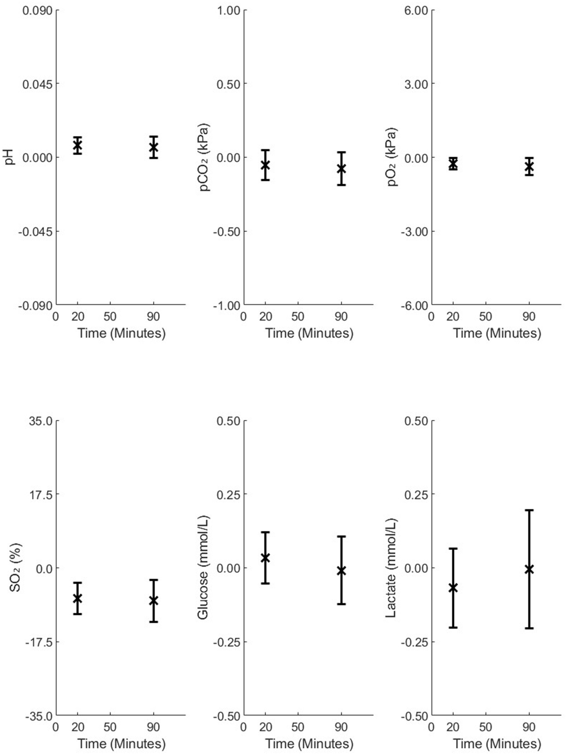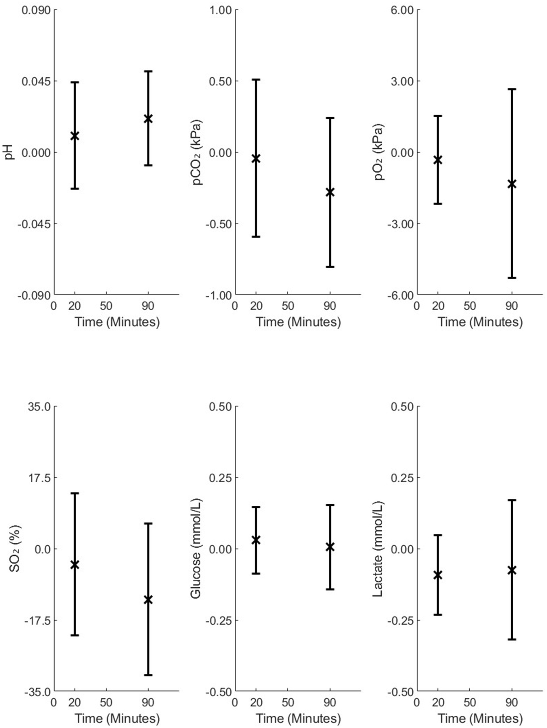 Six line graphs display changes over time (0, 20, 50, and 90 minutes) for pH, pCO2, pO2, SO2, glucose, and lactate. Each graph shows data points with error bars indicating variability.
