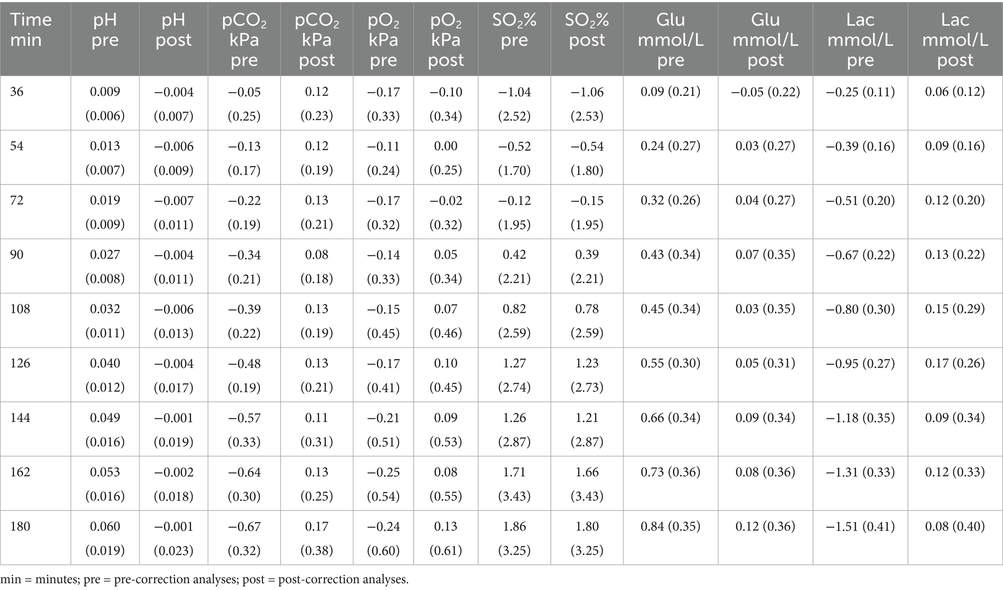 Table 1. Mean (±SD) of the differences for both pre-correction and post-correction analyses in standard blood gas syringes from Study 1.