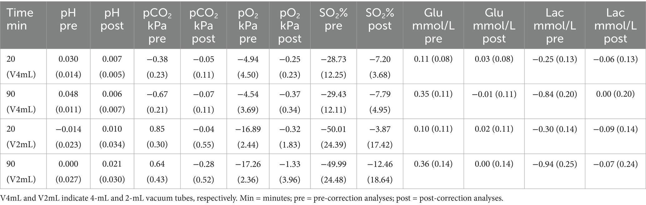 Tables 1, 2 summarize the mean differences and standard deviations (SD) of the differences for six variables—pH, pCO₂, pO₂, SO₂, Glu, and Lac—for both pre-correction (before applying the model) and post-correction (after applying the model) analyses. For pre-correction, the differences were calculated as the measured baseline values (time 0) minus the measured values from samples analyzed at specific time points: 36, 54, 72, 90, 108, 126, 144, 162, and 180 min for Study 1 and 20 and 90 min for 4-mL and 2-mL vacuum tubes in Study 2. For post-correction, the differences were calculated as the baseline values minus the values back-calculated by the mathematical model at the sample time. The model used measurements from the later analysis times to correct for delayed analysis in Study 1 and both delayed analysis and gas contamination in Study 2, thereby calculating the original blood values at the time the sample was taken.