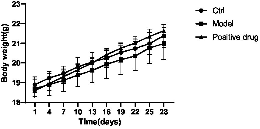 Eighteen male C57BL/6 mice with a body weight between 18 and 20 g were selected. The housing room temperature was controlled at 24–26°C, the humidity was 10–30%, and the mice had free access to drinking water and food. After 1 week of adaptive feeding, they were randomly stratified by body weight and divided into three groups. They were randomly assigned to the blank group (6 mice), the model group (6 mice), and the positive drug group (Shouhui Tongbian Capsules at 90 mg/kg) (6 mice). Shouhui Tongbian Capsules, a traditional Chinese patent medicine for constipation treatment, can promote intestinal motility by regulating the intestinal flora. The results of both the main experiment and the preliminary studies showed that administration of Shouhui Tongbian Capsules could increase ghrelin levels; therefore, it was used as an intervention drug. The relevant results are shown in Figures 1–3.