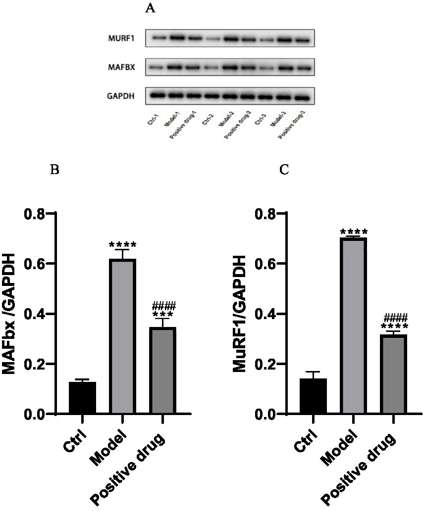 Total proteins were extracted from each group of cells and the hind limb muscles of C57BL/6 mice. The concentration of the protein samples was determined using a BCA protein quantification kit and adjusted to a uniform concentration in accordance with the manual. 5X loading buffer was added to the equivalent samples and subjected to heat denaturation at 95°C for 5 min. The protein samples were electrophoretically separated on SDS-PAGE gel and then transferred to PVDF membranes. The membrane surfaces were blocked with 5% skimmed milk in TBST solution at room temperature for 1 h to minimize non-specific binding. Incubation was carried out overnight at 4°C with primary antibody (against AKT, p-AKT, pFoxo3a, MAFbx and MuRF1) diluent. The following day, the membranes were washed three times with TBST at room temperature for 10 min each time. Incubation with the corresponding horseradish peroxidase (HRP)-labeled secondary antibody was performed for 1 h at room temperature. The membranes were washed again three times with TBST for 10 min each time. Development was carried out using a chemiluminescent substrate (ECL). Data analysis: the protein bands were captured in the imaging using ChemiDoc MP Imaging System and the gray values of the protein bands were measured using Gel-Pro32 analysis software. The ratio of the gray values of the target proteins (AKT, p-AKT, pFoxo3a, MAFbx, MuRF1) to the internal reference (GAPDH) was calculated as the relative quantity of protein expression levels.