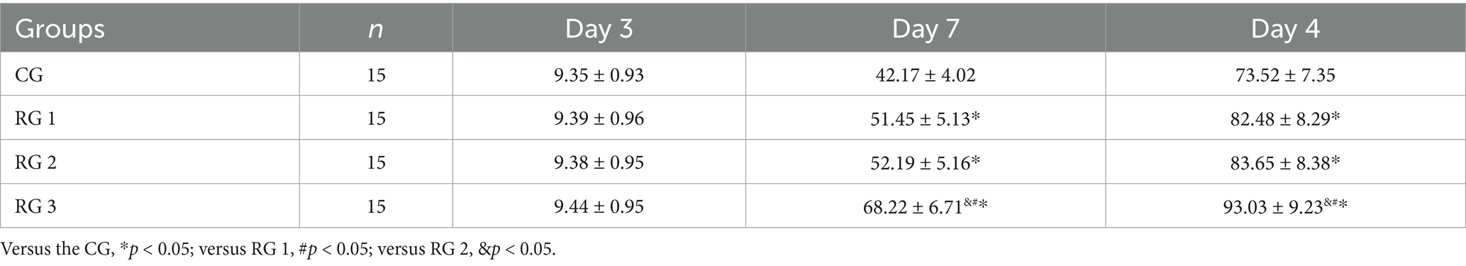 Figure 1. Trauma healing rate in the four groups. Versus the CG, *p < 0.05; versus RG 1, #p < 0.05; versus RG 2, &p < 0.05.