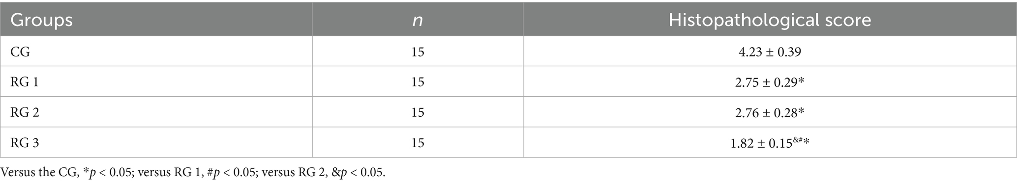 Figure 2. H&E and Masson’s trichrome staining of the rat trauma tissue in the four groups. Versus the CG, *p < 0.05; versus RG 1, #p < 0.05; versus RG 2, &p < 0.05.