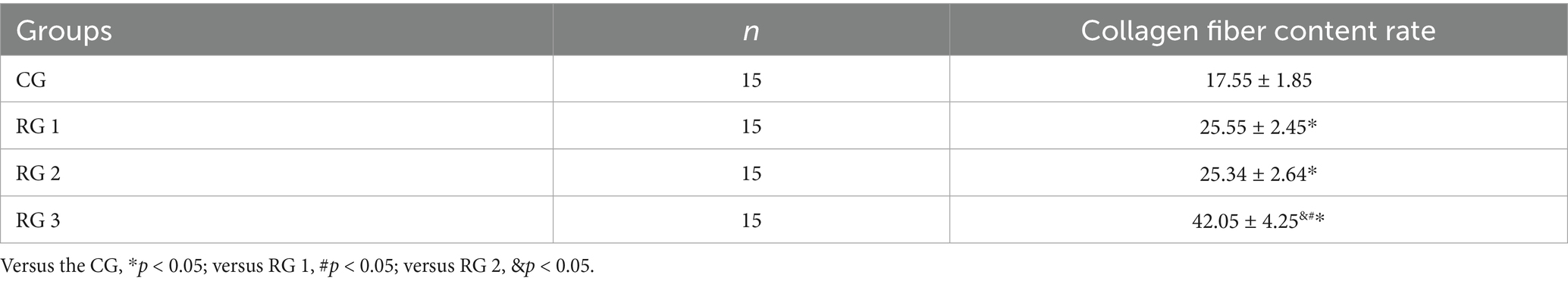 Hydroxyproline is a non-essential amino acid and a major, relatively constant component of collagen fibers and proteins. When collagen metabolism changes, the hydroxyproline content also changes accordingly (23). Therefore, the hydroxyproline content in skin tissue can indirectly reflect the condition of trauma healing. The results of this study indicated that on day 14 of treatment, tissue hydroxyproline contents in all research groups were elevated compared to those in the CG (p < 0.05). The tissue hydroxyproline content in RG 3 was elevated compared to that in RG 1 and RG 2 (p < 0.05; Figure 3; Table 4). Under collagen sponge intervention, the hydroxyproline content in the rat skin tissue presented a remarkable increase, indicating that the combination of collagen sponge and SP can facilitate the production and secretion of hydroxyproline in the skin, thereby elevating the synthesis and precipitation of collagen, which is beneficial for tissue regeneration and recovery.