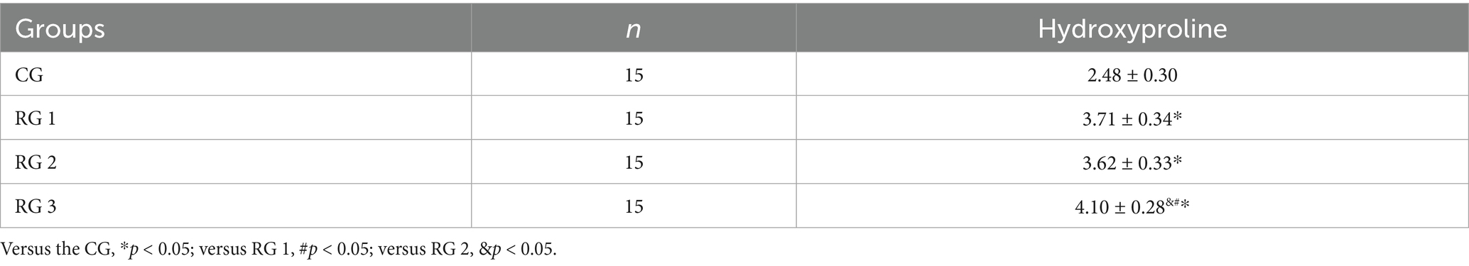 Figure 3. Hydroxyproline levels in the four groups. Versus the CG, *p < 0.05; versus RG 1, #p < 0.05; versus RG 2, &p < 0.05.