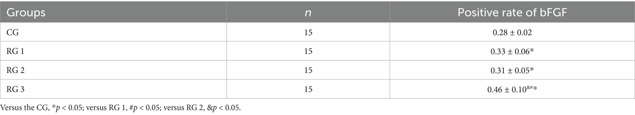 On day 14 after treatment, immunohistochemical staining of the tissue sections was performed according to the SABC method, following the instructions provided with the kits. The anti-bFGF antibody (1/200, BS-0217R, Thermo Fisher, United States) was diluted, and the primary antibody was replaced with PBS as a negative control, followed by observation under a microscope after sealing. The appearance of brownish-yellow or brownish particles in the cytoplasm (membrane) was considered positive. A total of 10 random high-power fields were selected, the number of positive cells in each field was observed, and the positive expression rate was calculated.