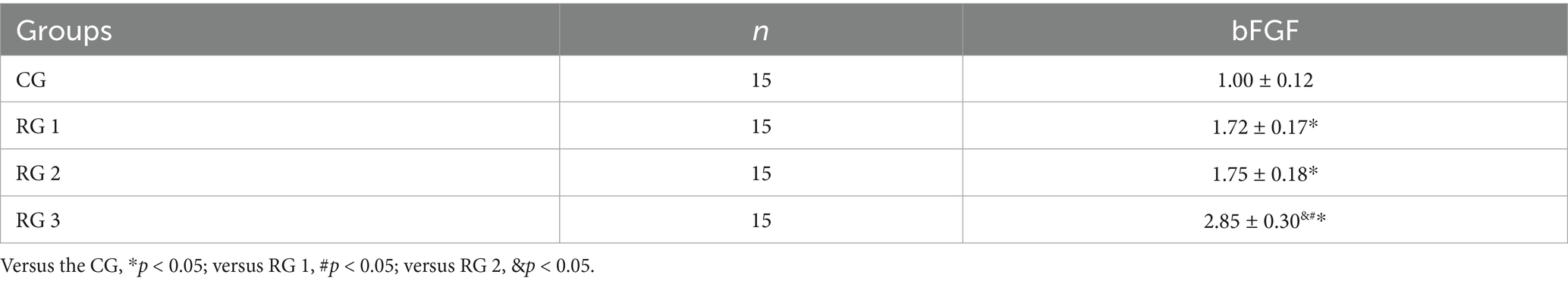 Figure 4. bFGF levels in the four groups. Versus the CG, *p < 0.05; versus RG 1, #p < 0.05; versus RG 2, &p < 0.05.