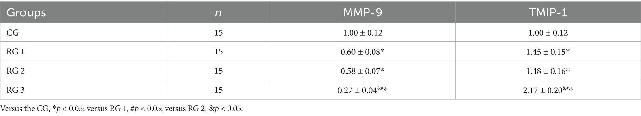 Figure 6. MMP-9 and TIMP-1 protein levels in the four groups. Versus the CG, *p < 0.05; versus RG 1, #p < 0.05; versus RG 2, &p < 0.05.