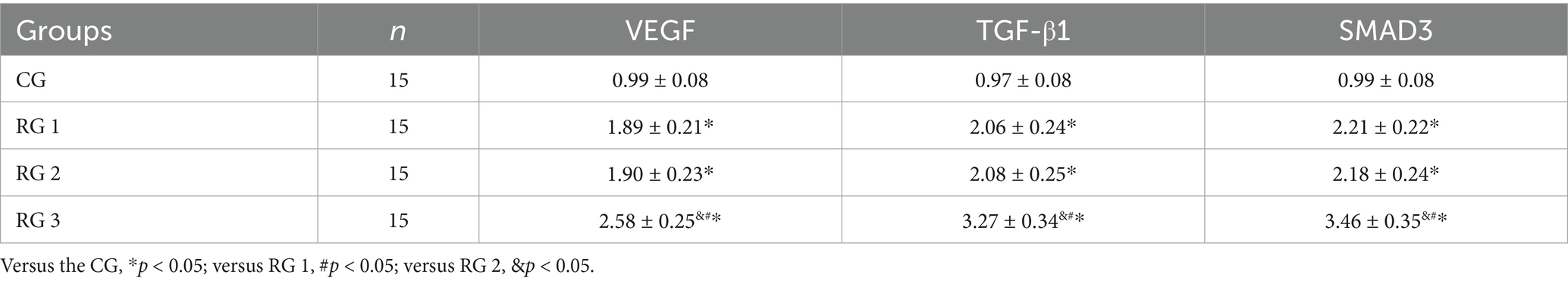 Figure 7. VEGF, TGF-β1, and SMAD3 mRNA levels in the four groups. Versus the CG, *p < 0.05; versus RG 1, #p < 0.05; versus RG 2, &p < 0.05.