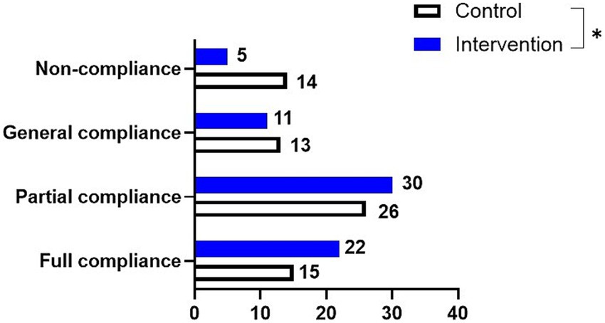 The nursing compliance of the intervention group (92.65%) was higher than that of the control group (79.41%) (p = 0.026, Figure 1).
