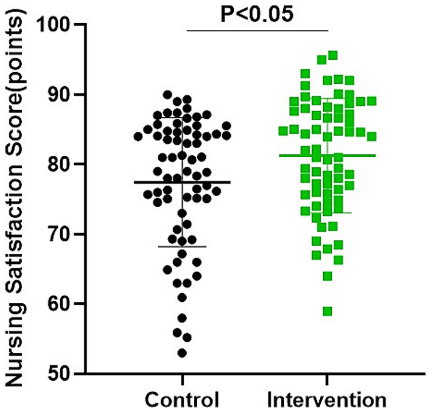 As shown in Figure 3, the satisfaction score of the intervention group was (81.25 ± 8.17) points, and that of the control group was (77.40 ± 9.35) points. Compared with the control group, the intervention group had higher satisfaction score (p = 0.012).