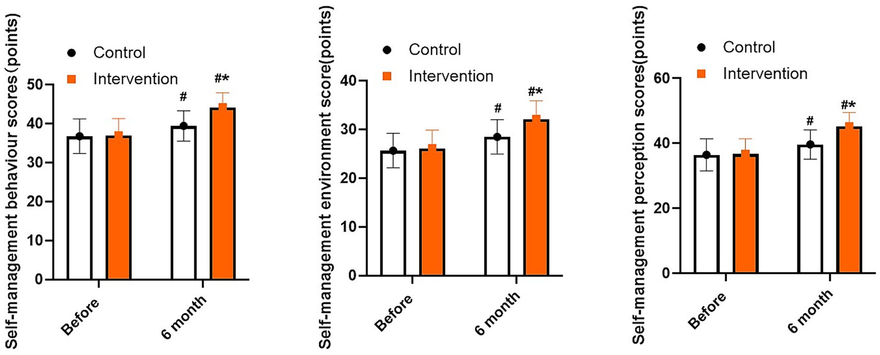 As shown in Figure 2, there were no significant differences in the scores of self-management behavior, self-management environment, and self-management cognitive between the two groups (p > 0.05). After 6 months of intervention, the scores of self-management behavior, self-management environment, and self-management cognitive of both groups were elevated (p < 0.05). Compared with the control group, the intervention group had higher scores of self-management behavior, self-management environment, and self-management cognitive (p < 0.05).