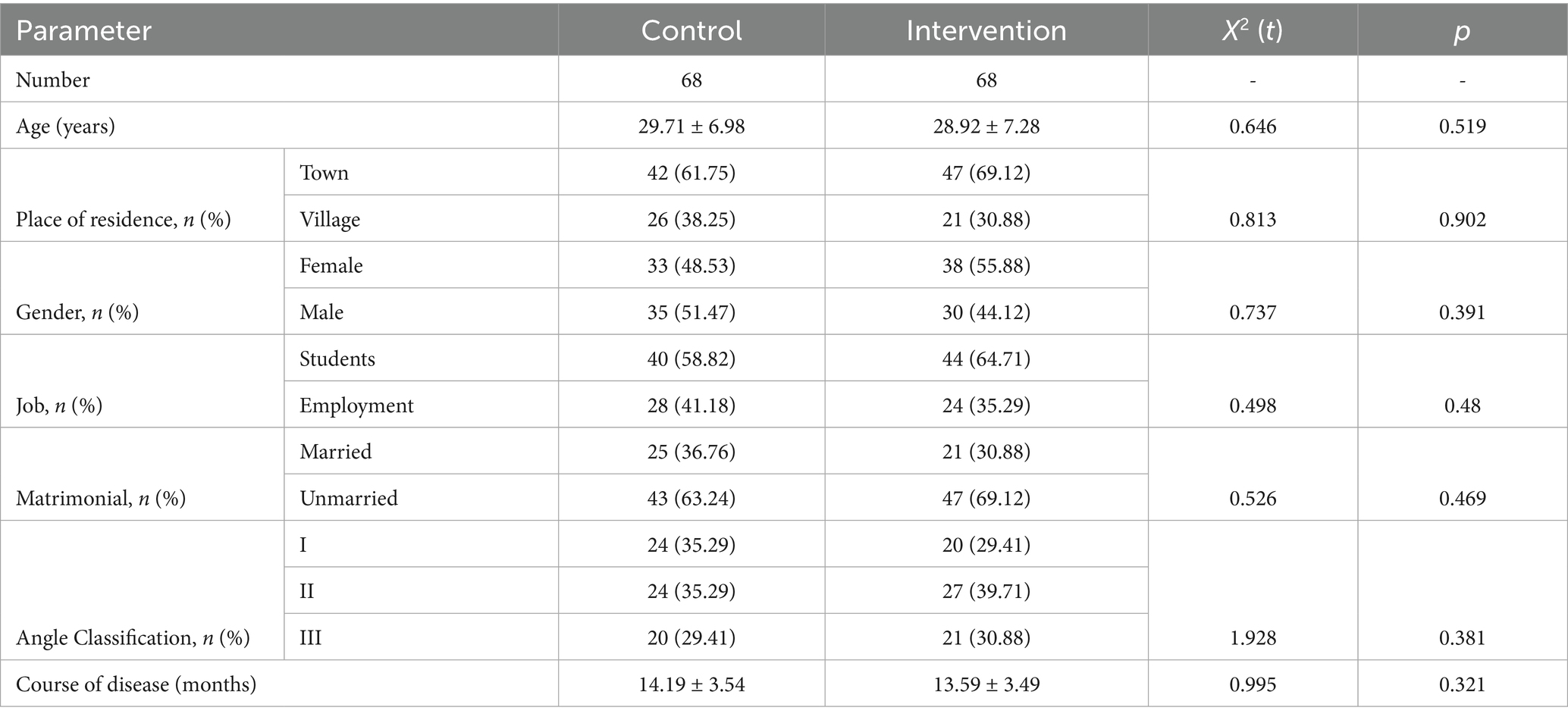 A total of 136 orthodontic patients were included in this study. There was no loss of cases between the two groups. The mean age of the patients was (29.11 ± 8.04) years, with the maximum age being 39 years and the minimum age being 17 years. There was no statistically significant difference in the baseline data between the two groups, as shown in Table 1 (p > 0.05).
