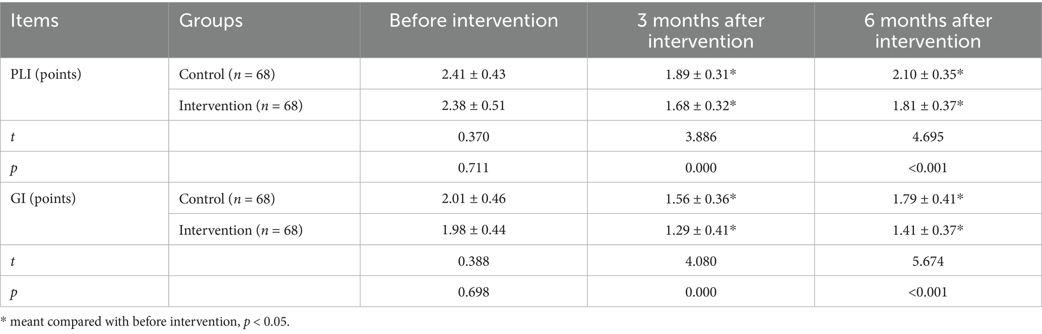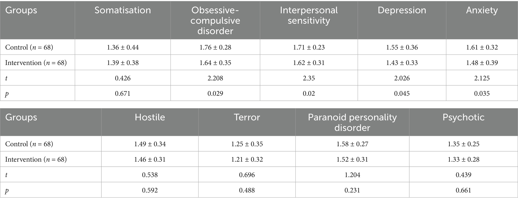 As shown in Table 4, compared with the control group, the intervention group had lower SCL-90 scores in terms of obsessive-compulsive disorder, interpersonal sensitivity, depression and anxiety (p < 0.05).