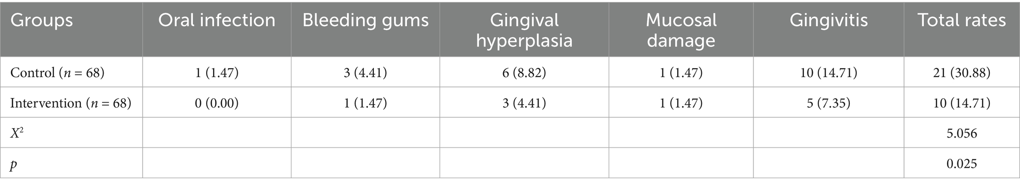 As shown in Table 3, the incidence of complications was significantly lower in the intervention group (14.71%) than that in the control group (21.00%) (p = 0.025), with gingival hyperplasia and gingivitis being the most common complications.