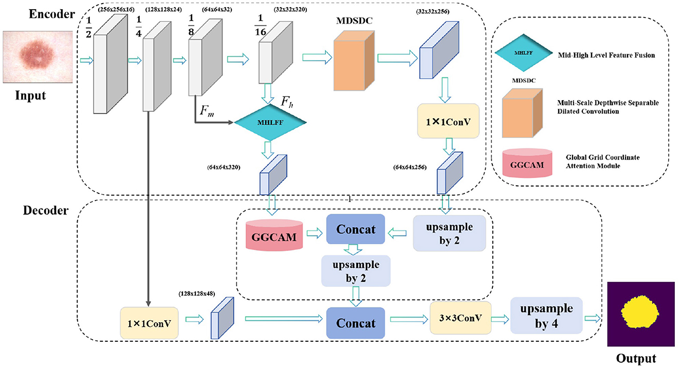 The DMFF-Net model introduced in this study is aimed at addressing several key challenges in skin lesion segmentation, including fuzzy lesion borders, poor contrast, and the irregularity of lesion areas. As illustrated in Figure 1, our model has three main modules: the MDSDC module, the GGCAM module, and the MHLFF module. It is mainly composed of an encoder and a decoder. Firstly, the MHLFF module has been integrated into the original DeepLabV3 model. This module enhances the model's ability to understand and represent complex scenes by fusing mid-level and high-level features. Following the combination of mid-level and high-level features in the decoder stage, the GGCAM module was created and implemented. Using the global data from the feature maps' spatial dimensions (height and breadth), this module creates attention maps. To improve feature representation even more, these attention maps are then used to weight the input feature maps.