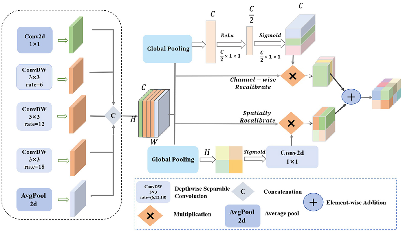 Firstly, our MDSDC architecture employs five parallel convolutional branches for multi-scale feature extraction. Each branch is configured with a different dilation rate to expand the receptive field and capture varying spatial information. The first branch uses a 1 × 1 convolution kernel to maintain the spatial scale and directly extract features. The second branch utilizes a 3 × 3 convolution kernel with a dilation rate of 6 to moderately expand the receptive field. The third branch employs a 3 × 3 convolution kernel with a dilation rate of 12 to further expand the receptive field and capture broader contextual information. The fourth branch uses a 3 × 3 convolution kernel with a dilation rate of 18 to provide the widest receptive field. The fifth branch applies global average pooling to extract global contextual features, enhancing the model's understanding of the overall layout. After these processes, the feature maps have the shape H×W×C. The Concat function is used to concatenate the different outputs along the channel dimension, resulting in a comprehensive feature map. Let the input feature map be X∈ℝH×W×C, where H, W, and C are the height, width, and number of channels, respectively. The outputs of the five branches can be mathematically described as follows: