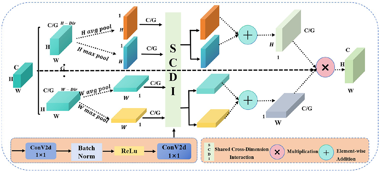 For each grouped feature map Fg, global average pooling and global max pooling are performed separately along the height and width directions, resulting in pooling outputs for both height and width.