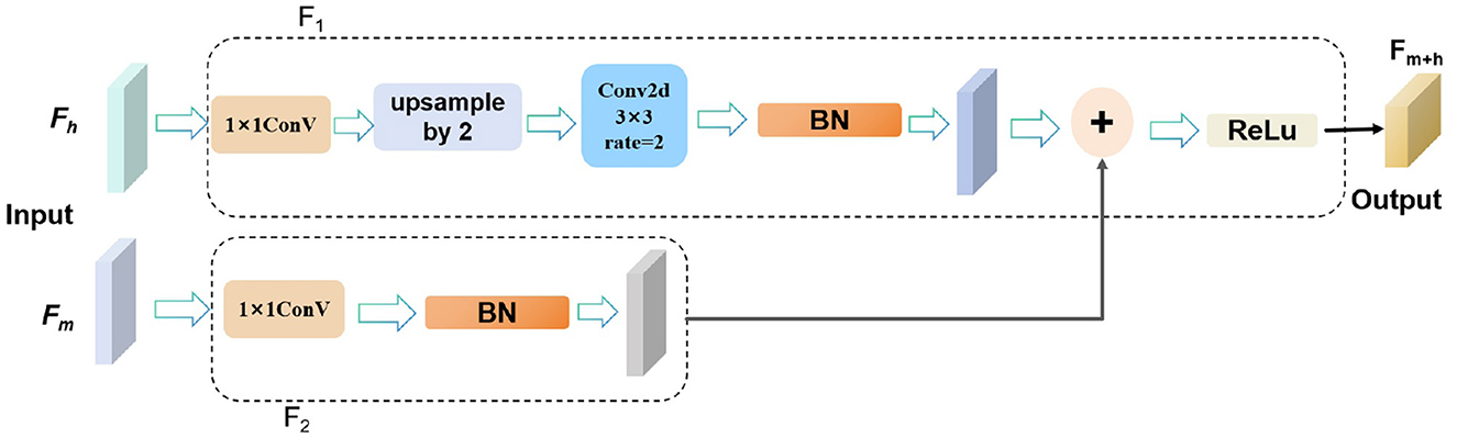 To capture rich semantic and contextual information, facilitate feature sharing across different layers of the network, and enhance the network's learning ability and generalization capabilities, we fuse the image features from the seventh layer and the final layer of the backbone network. As shown in Figure 4. Specifically, the mid-level features Fm from the seventh layer are input into the F1 module, which processes them using a 1 × 1 convolution followed by batch normalization to produce output OP1. Simultaneously, the high-level features Fh from the final layer are processed in the F2 module, where a 1 × 1 convolution is applied for dimensionality reduction, followed by upsampling and a 3 × 3 dilated convolution with a dilation rate of 2, concluded by batch normalization to yield output OP2.