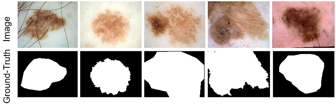 Four publicly accessible datasets from the International Skin Imaging Collaboration (ISIC) were used in this study to assess our methodology: ISIC 2016 (47), ISIC 2017 (48), ISIC 2018 (49), and the PH2 dataset (50). While Figure 5 displays some photos and the label maps that correlate to them. These tests assessed how well the suggested approach performed in tasks involving the segmentation of skin lesions.